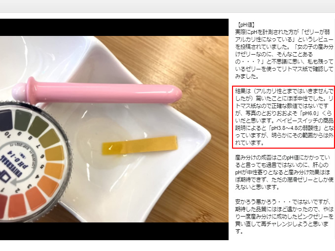 これらの口コミからも分かるように、商品の個体差があるのではなく、ベイビースイッチガールは(弱酸性ではなく)ほぼ中性のゼリーと考えるのが妥当ではないでしょうか。