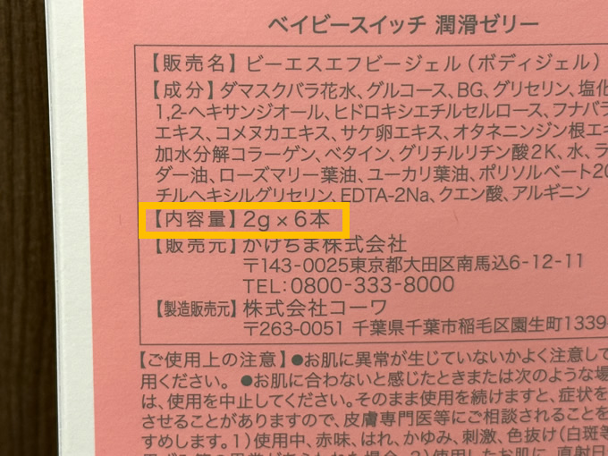 商品説明どおり、ベイビースイッチのパッケージには1本あたり2g入りと記載されています。