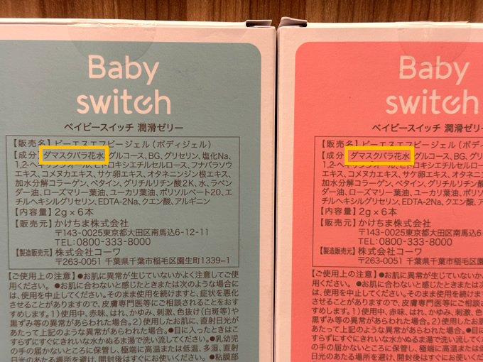 その原因を調べてみたら、ベイビースイッチはガールもボーイも主原料が『ダマスクバラ花水』になっていました。