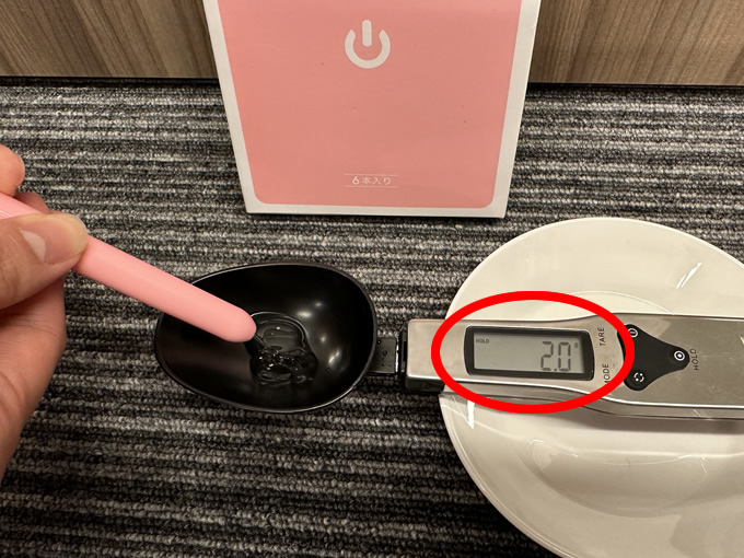 スケールで実測してみると、記載どおり2.0gという結果が出ました。