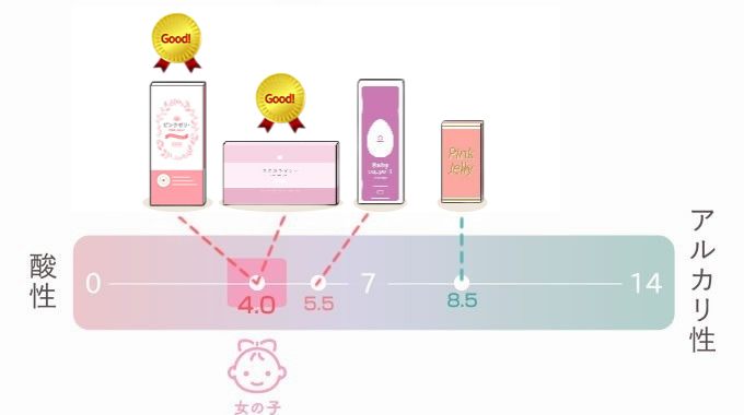 女性の膣内は弱酸性で、アルカリ性が強すぎるゼリーは膣トラブルを引き起こす可能性があります。男の子用のゼリーを使う場合、pH値が8.0以上の強いアルカリ性のものは避けた方が良いです。世界的にもpH値が7.5程度のものが一般的です。