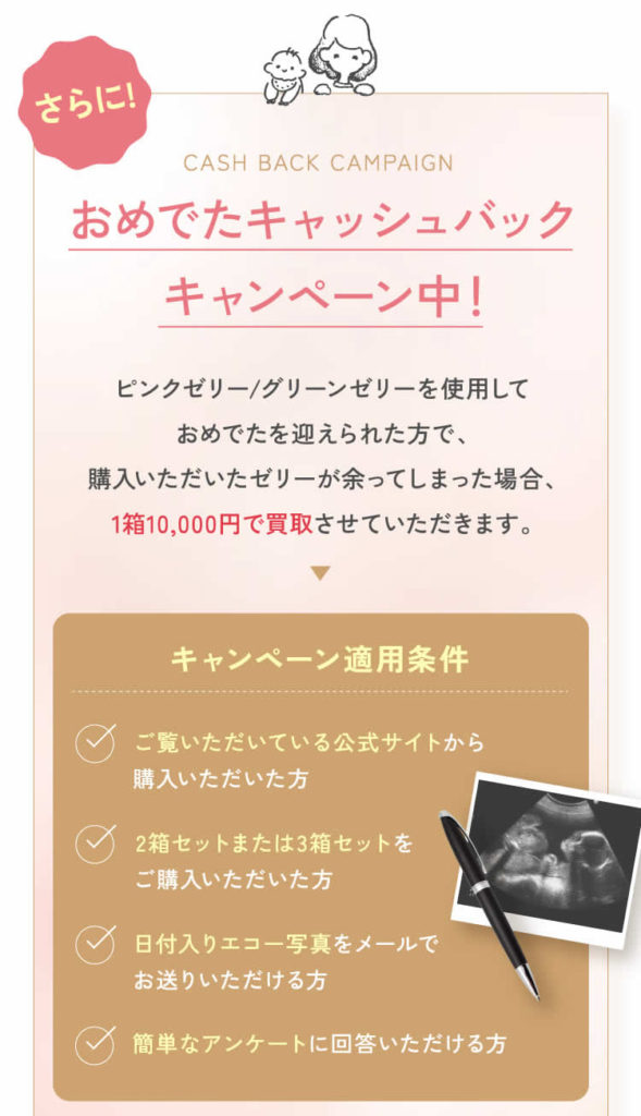 こちらも産み分けゼリーならではの特色あるサービスですが、商品を購入した方が見事妊娠した場合、残った『ピンクゼリー』『グリーンゼリー』を1箱10,000円で買い取ってくれるというサービスです。