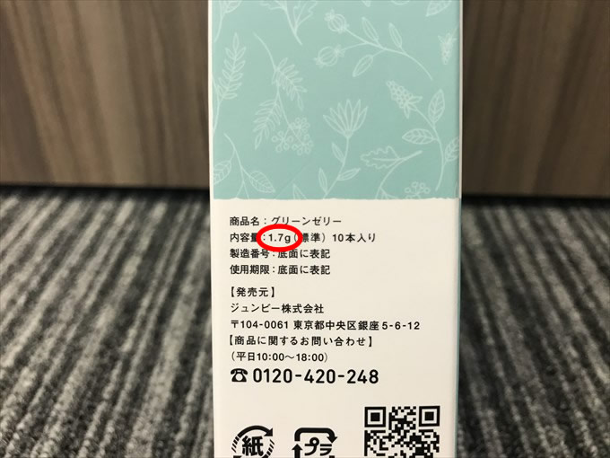 ジュンビーのピンクゼリー・グリーンゼリーは、研究結果のとおり1本あたり1.7g(ml)の内容量になっています。