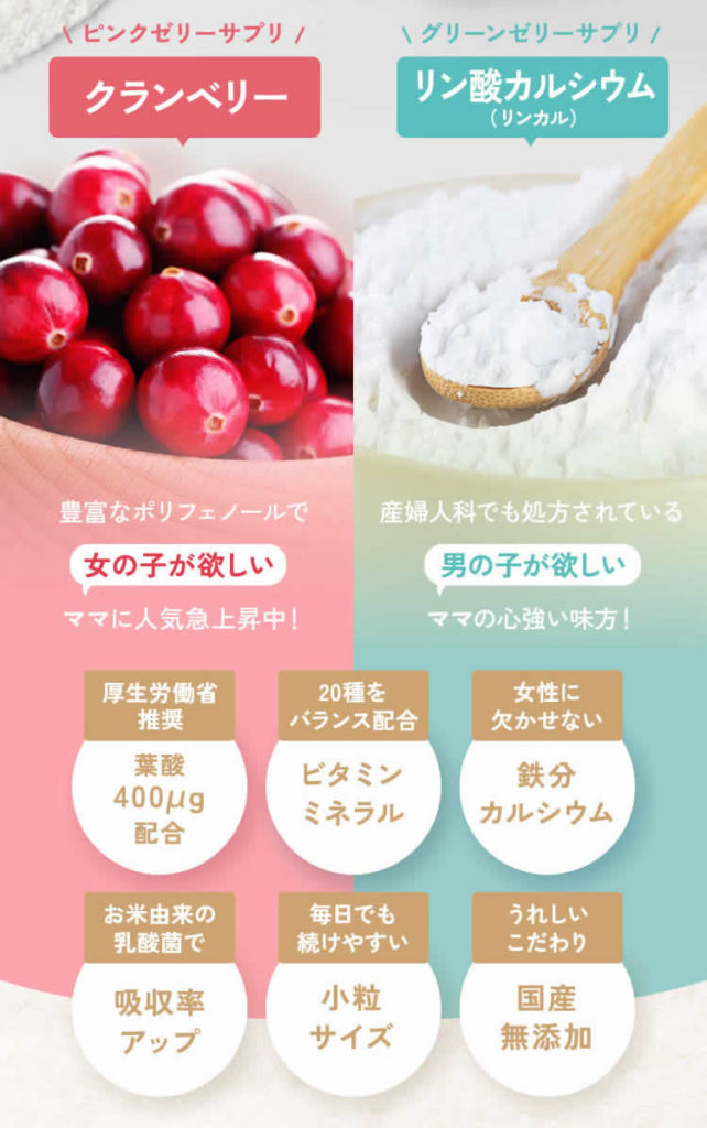 女の子の産み分けに効果があるとされる「クランベリー」と、男の子の産み分けに効果があるとされる「リンカル」を配合し、さらに「葉酸」を配合しているのがポイントです。