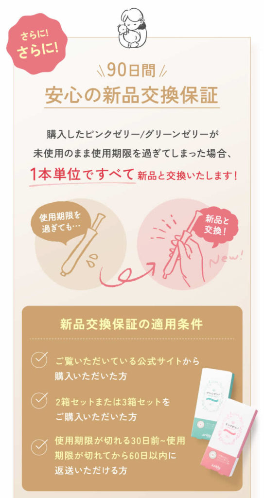 このサービスがあるおかげで、購入したピンクゼリー・グリーンゼリーが1本も無駄になることなく使える点で非常にありがたいです。使用期限内に使い切れないケースが出てくることを想定してこういった独自サービスを用意していると思うのですが、品質へのこだわりというか、購入者に安心感を届けたいという販売側の思いやりのようなものをすごく感じました。