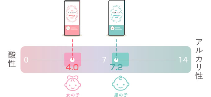 産み分け効果を測る上で、絶対に外せないチェック項目が「pH値」。ゼリーのpH値が、産み分けの成功率を大きく左右します。それでは、女の子用の産み分けゼリーと男の子用の産み分けゼリーはどれくらいのpH値になっているのが理想なのか?簡単に図にまとめてみました。